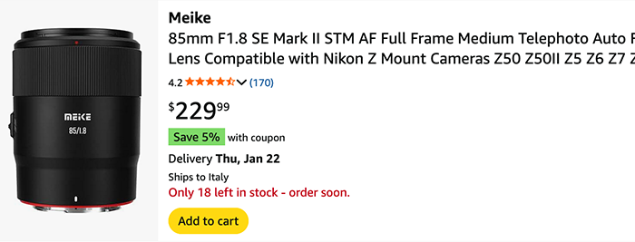 New Meike 85mm F1.8 SE Mark II Z lens announced 14th January 2026 News 0 Comments The new Meike 85mm f/1.8 Full Frame autofocus Z-mount lens is now available for preorder at Amazon, BHphoto and Meike.